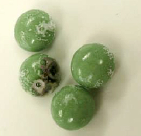 内容物に水分が付着して表面の緑色のコーティングが溶け、内部の原料の色が出てきたためです。